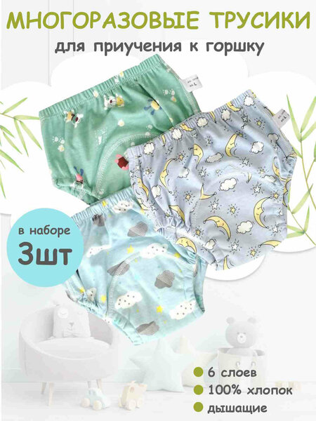 Трусики для приучения к горшку– это современный способ приучить малыша к горшку максимально быстро с минимумом луж на полу. Ребенок думает, что на нем обычные трусики, которые становятся влажными внутри. Однако из них не течет на пол, если он не успевает дойти до горшка. Трусы для приучения к горшку имеют 6 впитывающих слоев из 100% хлопкового муслина. Особая забота о коже малыша - натуральный хлопковый трикотаж - мягкий и нежный, как мамино прикосновение. Для удержания влаги в районе ластовицы предусмотрен слой с непромокаемой микропористой мембраной. По ножкам многоразовые трусики для приучения к горшку должны сидеть плотно, в таком случае они не будут подтекать. Многоразовые трусики подгузники предназначены для детей от 1,5 до 3-4 лет. Когда малыш заигрывается и не успевает добежать до горшка, немного намочив трусики, небольшое количество жидкости впитывается во внутренний слой трусиков, и ваша мебель и одежда малыша остаются сухими. Натуральный хлопок внутреннего слоя намокает, и малышу становится неприятно. Малыш снимает трусики и идет в туалет. Он чувствует влагу после использования трусиков, что и требуется для приучения к горшку. Тренировочные трусики для приучения к горшку рассчитаны на один попис, после этого их нужно поменять. Поверх них не рекомендуется одевать одежду. Рекомендуем использовать детские трусики для приучения к горшку во время бодрствования малыша. При использовании их во время сна возможны протекания, так как трусики не имеют непромокаемого слоя в верхней части. Многослойные трусики подбираются по размеру. Размеры согласно размерной сетке. Обратите внимание! Для лучшего впитывания многоразовые трусы для приучения к горшку нужно 3-4 раза постирать. После стирки они могут давать усадку примерно на половину размера. Стираются трусики вручную или в стиральной машине при температуре до 40 градусов. внимание! Трусики для приучения к горшку не заменят подгузники! Они разработаны специально для малышей, которые уже начинают ходить на горшок!
