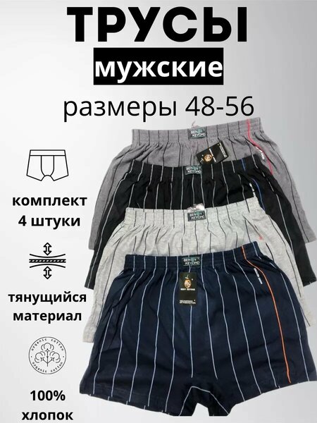 Набор мужских боксеров, состоит из 4 трусов в полоску, разной расцветки. Дышащая ткань боксеров - гипоаллергенный чистый 100 % хлопок. Хлопковая ткань приятна к телу, швы не давят и не колятся, резинка мягкая, хорошо тянется, не сковывает движения, такой фасон защищает кожу от натирания. Изделие сшито качественно и не создает дискомфорта во время носки. Боксеры не потеряют форму и цвет после множества стирок, качество трусиков очень хорошее. Мы производим мужские трусы очень износоустойчивые и прочные, чтобы обеспечить длительное использование нашим клиентам. Комплект трусов боксеров вы можете приобрести как себе так и сделать оригинальный подарок любимому мужчине, мужу, другу, парню, папе, брату, для него на 14 и 23 февраля, день рождения