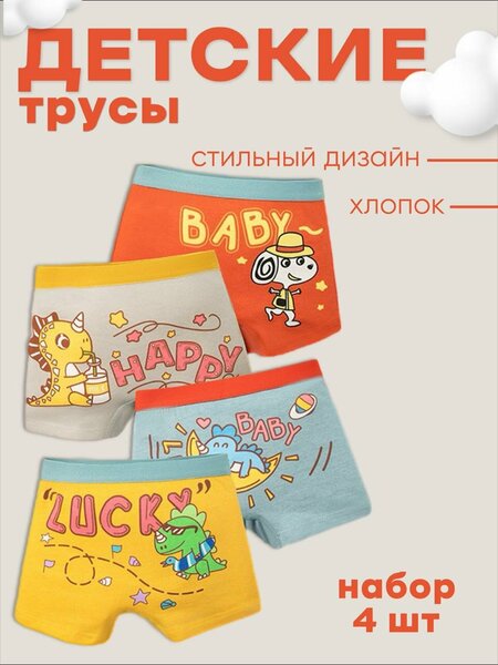 Детские трусы боксеры набор 4 штуки подойдут для мальчика в любом возрасте Набор трусов для мальчика за счет большого размерного ряда подойдет для детей и подростков. Набор включает в себя 4 пары трусов изготовленных из высококачественного хлопка. Боксеры для мальчиков за счет этого обладают мягкостью и комфортом, который ваш малыш заслуживает. Трусы детские с высокой посадкой на талии и широкой резинкой, что обеспечивает комфорт во время ношения. Набор боксеров детских состоит из базовых моделей, которые подойдут каждому мальчику. Подходят как для повседневного использования, так и для занятий спортом. Набор станет отличным подарком на новый год или рождество, на 23 февраля или любой другой праздник.