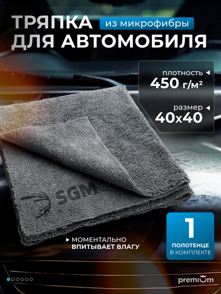 Фирменная салфетка для автомобиля из микрофибры от SGM - незаменимый помощник в уходе за вашим авто. Изготовленная из высококачественной плюшевой микрофибры, тряпочка обладает отличными впитывающими свойствами и не оставляет разводов и ворса на поверхности автомобиля. Большой размер 40х40 см делает полотенце удобным для мойки, уборки, чистки и сушки кузова. Полотенце имеет безворсовую структуру и позволяет бережно удаляет пыль, грязь и следы от воды. Фибро тряпка для машины двухсторонняя и обладает высокой плотностью ворса - до 450 г/м2. Микрофибровое автомобильное полотенце подходит для мытья и протирки салона, полировки зеркал и химчистки, оставляя поверхности без царапин. Благодаря своим свойствам микро фибра для авто способна впитывать до 500 % влаги от собственного веса. Больше не надо часто выжимать тряпку, когда моешь автомобиль. Автомобильная салфетка подойдет для разных типов поверхности: пластика, фар и стекол, а также может применяться для детейлинга и автомойки. Автополотенце выдерживает до 500 циклов стирки при температуре 40 градусов. Долговечно и удобно в применении. Не упустите возможность приобрести универсальную фибро салфетку для вашей машины и подарите своему авто заботливый и качественный уход, который она заслуживает. В нашем магазине вы сможете заказать наборы фирменной салфетки с логотипом от SGM по 1 шт, 3 шт, 5 шт. Они отлично подойдут в качество подарка и аксессуара для авто.