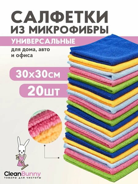 Универсальные салфетки для уборки размером 30х30 см впитывающие, состоят из полиэстера 80% и полиамида 20%, именно в таком соотношении свойства материала наиболее качественно проявляют себя в работе. Инновационные кухонные тряпки многоразовые, оптимальной плотности 220 гр/м2. Чудо тряпочки образует антистатический эффект, притягивая частички пыли, обладают антимикробными и противогрибковыми свойствами. Тряпка быстро сохнет, не имеет запаха и не накапливает бактерий. Их можно использовать в квартире для влажной и сухой уборки мебели от пыли и удаления жирных пятен, на даче, в ванной для чистки сантехники и ванны, на кухне для посуды, для мойки раковины, стола, варочной панели. А также стеклокерамических плит, бытовой техники, глянцевых фасадов, для мытья унитаза, туалета. Салфетка для кухни - незаменимая вещь для протирания кухонных принадлежностей после мойки и полировки до блеска. Подходят для ухода за монитором компьютера, ноутбука, смартфона, телефона. Клининг активно применяет для быстрого очищения любых поверхностей и помещений. Супер комплект хозяйственных товаров для профессионального использования. Мягкие чистящие автосалфетки помогут помыть салон авто, кузов, фары, автомобильные диски. Самый хороший набор для стекол, пластиковых окон и зеркал, так как одна сторона более гладкая, безворсовая. Цвета тряпочек могут отличаться по оттенку (быть ярче) чем на фотографиях и видео. Внимание! Возможно отклонение от параметров +/- 1см. Можете стирать в стиральной машине при температуре не выше 30-40 градусов. Тряпочную умную салфетку можно использовать без применения химии и моющих средств. CleanBunny станет верным помощником в производстве чистоты для Вашего дома, поможет женщинам навести домашний уют, все лучшее для Вас!