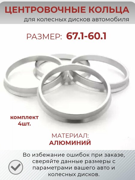**Для того, чтобы сделать центральное отверстие диска, соответствующим параметрам ступицы вашего автомобиля и обеспечить его надежную посадку, при монтаже необходимо применять центровочные кольца.****Если на выступе ступицы жестко не фиксировать посадочное отверстие колеса, то центровка колеса выполняется болтами или шпильками. Такое крепление колеса не может обеспечить достаточную центровку, вследствие чего возникает смещение диска, и в результате появляются следующие проблемы:****-биение рулевого колеса *-возникновение механических вибраций кузова автомобиля- **-неравномерное изнашивание шины;**- **преждевременный выход из строя резинотехнических деталей в подвеске**- внешний диаметр кольца: **67,1 мм**- внутренний диаметр кольца: **60,1 мм**- **материал: алюминий****При заказе, сверяйте данные с параметрами на вашем автомобиле и на колесном диске.