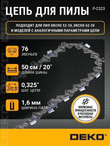 Цепь для бензопилы DEKO P-CS23, 20", 0.325", 1.6 мм, 76 звеньев подходит для модели DKCHS 52-20 и DKCHS 62-20. Поставляется в картонной упаковке. Технические характеристики: Ширина паза: 1,6 мм Шаг цепи: 0,325" Количество звеньев: 76