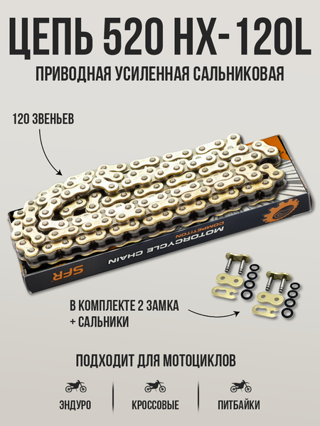 Приводная цепь SFR 520HX 120L усиленная, сальниковая, золотая с замком – это высококачественный трансмиссионный компонент для мотоциклов Кайо, БМВ, КТМ, Дукати, Сузуки, Ямаха, Кавасаки, Авантис, Мотоленд, Рейсер, Зонгшен, Бсе, Регулмото, Лончин, Казума, БРЗ, ГР, Рокот, Зум, Зумав, Хаски, Прогаси, Атаки, обеспечивающий плавную и надежную передачу мощности. Произведенная известным брендом SFR, данная оригинальная сальниковая цепь отличается повышенной износостойкостью благодаря использованию современных технологий. Сальниковые цепи имеют значительно больший ресурс по сравнению с бессальниковыми они служат как минимум в два, а порой и в три раза дольше. Конструкция с X-Ring сальниками эффективно удерживает смазку внутри шарниров, снижая трение в 2 раза по сравнению с O-Ring цепями. Это обеспечивает увеличенный ресурс службы - в 1,5-2 раза дольше оснащенными O-Ring цепями. Шаг цепи: 520HX Количество звеньев: 120L Шаг, мм: 15,875 Диаметр ролика max, мм: 10,16 Ширина между внутренними пластинами min, мм: 6,35 Толщина внешней пластины, мм: 2,4 Толщина внутренней пластины, мм: 2,4 Диаметр валика max, мм: 5,24 Длина валика, мм: 22 Разрушающая нагрузка min, кН: 34 Тип замка: Замок-Защелка Благодаря универсальным параметрам подходит для широкого спектра мотоциклов Minsk, Lifan, IRBIS, Honda, KAYO, BMW, KTM, Ducati, Suzuki, Yamaha, Kawasaki, Avantis, Motoland, Racer, Zongshen, BSE, Regulmoto, Jianshe, Loncin, Bashan, Diamo, Jonway, Yawati, Kazuma, Kinroad, BRZ, GR, Rockot, Zuum, FX Moto, Xmotos, Hasky, Progasi, Ataki; объемом 190-550 см³, включая модели CB/CG 250cc, ZS166FMM (CB 250), ZS167FMM (CG250-B, CBB250), ZS172FMM-3A (CB250-F), ZS172FMM-5 (PR250). Для A7, A8, GL250, MT250, X5 Lite, A2, FX250, NT250, TTR 250R, ZR 250, X5M, GR 7 F250A Enduro Optimum, T2 250 ENDURO, FX K5, EF250, DR250 Enduro, Enduro 250, GR 8 F250A Enduro Optimum, и других! Для поддержания оптимальных характеристик рекомендуется регулярное обслуживание – очистка и своевременная смазка цепи. Использование качественной смазки значительно продлевает срок службы трансмиссионного узла.