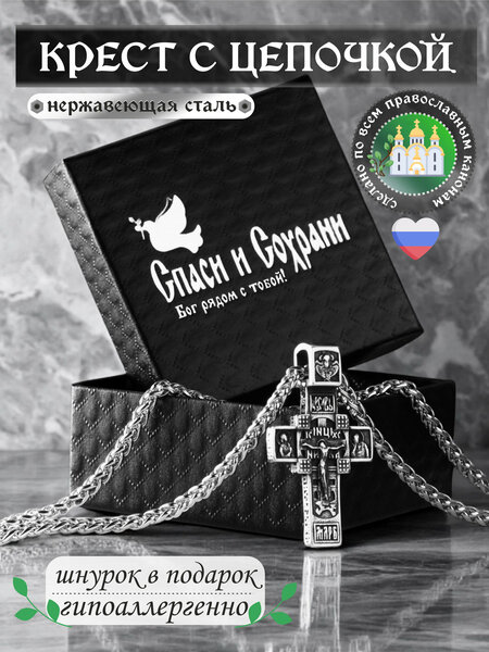 Цепочка с крестиком изготовлены из высококачественной нержавеющей стали 316-L. Эта сталь прочнее серебра, не темнеет и не боится воды. Крестик с цепочкой можно не снимать при приёме душа! Изделие не потемнеет со временем и не потеряет свой первоначальный блеск! Крестик мужской православный из стали изготовлен методом литья имеет качественную двухстороннюю детализацию, на передней части креста расположено распятие, на обратной стороне надпись Спаси и Сохрани! Православный крестик выполнен с эффектом чернения! Внешне выглядит как серебряный крестик! А по свойствам и характеристикам даже лучше серебра! Не потемнеет и не боится воды. Крест православный комплектуется цепочкой 60см толщиной 4мм, упакован в подарочную коробочку. Цепь длинная для подростков и молодежи. Цепочка с крестиком станет отличным подарком как себе, так и близкому человеку, идеально для подарка мужчине и женщине.