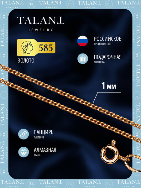 Цепочка полновесная из красного золота 585 пробы, плетение "Панцирь одинарный", ширина плетения 1 мм, алмазная грань. Технология алмазной грани придает красивый блеск, украшение сверкает и переливается. Изделие полновесное, что гарантирует его прочность и долговечность. Плетение "Панцирь одинарный" прочное и гибкое, украшение не деформируется и не запутывается при носке. Цепочка будет долго радовать вас, а может стать отличным подарком. Аксессуар подойдёт как для повседневного образа, так и торжественного мероприятия. Подлинность изделия подтверждается: пробирным клеймом (пробой), именником производителя, биркой и пломбой завода. Обратите внимание: фактический вес изделия может отличаться от среднего, указанного в характеристиках. О заводе: Санкт-Петербургский Ювелирный Завод "TALANT" - это крупный производитель по-настоящему качественной ювелирной продукции.