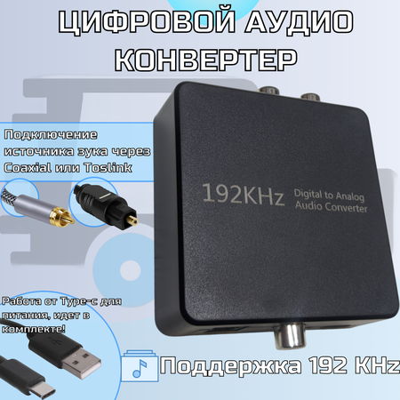 Конвертер звука с цифровых Coaxial / Toslink источников звука в Аналоговый аудио сигнал на входы RCA и 3.5 jack aux Этот Цап предназначен как для домашнего так и профессионального подключения аудио аппаратуры. Он конвертирует коаксиальный или оптический (Toslink) цифровой аудиосигнал в обышный аналоговый Пример применения: используется для вывода звука с Телевизоров Тв-приставок, звуковых карт и подключения к колонкам саундбарам, музыкальным центрам усилителям, ресиверам, наушникам, микшерам. Свойства конвертера: 1. Поддержка 2-канальный PCM (стерео) 2. Поддержка входной частоты 192 кГц 3. Отсутствие электромагнитных шумов при передаче 4. Простота в установке, никаких драйверов 5. Автоматическое переключение источников Характеристики преобразователя: Схема ЦАП MS8412 1. Входной аудио: LPCM (линейная импульсно-кодовая модуляция) 2. Входной аудио разъем: Toslink, (SPDIF) 1хRCA Cpaxial (коаксиальный) 3. Выходной аудио: стерео R / L 4. Выходной аудио разъем: 2хRCA R / L, 3.5 jack aux 5. Частота дискретизации: 32, 44,1, 48 и 96 кГц 192 кГц 6. Диапазон воспроизводимых частот от 20 Гц до 20 кГц ± 0,15 дБ 7. Соотношение сигнал-шум ≥ 90 дБ 8. Перекрестные помехи ≤ -85 дБ 9. Искажение ≤ 0,004% 10. Вес: 80 г. 11. Потребляемая мощность: 1 Вт (макс.) 12. 16-битный декодер (24- битные данные 16 значимых ) 13. Динамический диапозон 105 дБ Комплектация 1 Цап 1 кабель питания Type- c 1 Инструкция