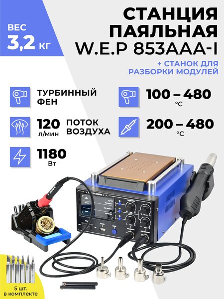 Паяльная станция W.E.P 853AAA-I - многофункциональный строительный инструмент для пайки, ремонта электроники, мобильных телефонов, бамперов автомобилей, термоусадочных работ, ручной установки радиоэлементов, монтажа, демонтажа электронных компонентов BGA, SMD, PLCC, и др. Электрический паяльник с керамическим нагревателем (t 200 – 480°С) и фен турбина (t 100 – 480°С) подойдут как для домашнего, так и для профессионального использования. Широкий диапазон рабочих температур позволят применять данную паяльную станцию в самых разнообразных условиях. Паяльник 1180Вт обеспечивает быстрый и надежный нагрев. Преимущество данного инструмента для ремонта – экономит место на рабочем столе, так как совмещает в себе 3 инструмента – электропаяльник, турбинный фен для станции и станок для разборки сенсорных модулей. Благодаря подставке для паяльника, держателю фена и губкам для чистки жал можно осуществлять безопасную работу без соприкосновения паяльника со столом и случайных ожогов. Набор для пайки имеет керамический нагреватель для разогрева паяльника, можно использовать удобные сменные жала 900M. Для удобного использования в комплекте с паяльником 900M уже есть 5 сменных жал для паяльника разной формы. Паяльник керамика имеет пластиковую рукоятку со специальным прорезиненным покрытием для удобной работы, которая обеспечивает надежный и уверенный захват инструмента. Паяльный инструмент обеспечивает возможность регулировки и поддержки заданной температуры, есть калибровка температуры. Керамический нагревательный элемент цифрового паяльника позволяет избежать поражения электронных компонентов напряжением, которое могло бы образоваться на жале при использовании обычного (металлического) нагревательного элемента. Удобная конструкция позволяет поменять, в случае необходимости, жало без проблем и лишних усилий. Есть LED дисплей индикации температуры паяльника, что позволяет достичь наименьшей погрешности при работе. У станции с паяльником есть переключение между C/F и калибровка температуры. Станция паяльная со станком отключается автоматически через 30 минут бездействия, а паяльник для паяльной станции уходит в спящий режим через 10 минут. Паяльник и аксессуары для пайки в нашем магазине — это всё, что нужно, чтобы правильно паять. Ознакомиться с ассортиментом того, что нужно для пайки, Вы можете на витрине нашего магазина.