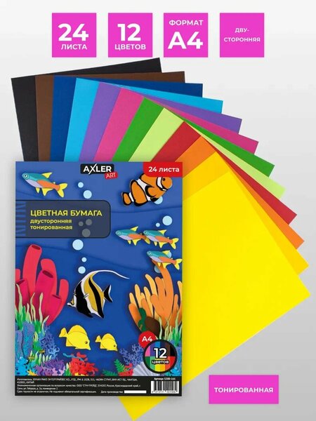 Цветная бумага двухсторонняя А4 AХLER Art, для школы и принтера, набор 24 листа (12 цветов)