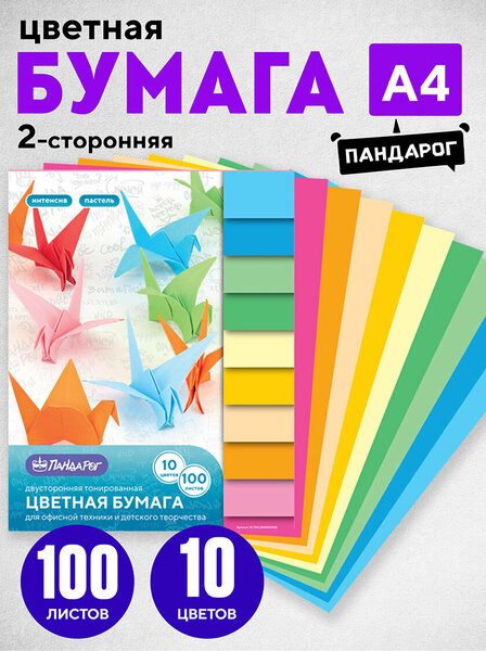 Набор двусторонней тонированной цветной бумаги 10 цветов, 100 листов - это прекрасный выбор для творчества и создания красивых поделок, разнообразных рисунков, аппликаций и оригами. Набор цветной бумаги состоит из 10 листов 100 цветов (10 интенсивных оттенков и 5 пастельных оттенков). Бумага формата А4 имеет размеры 210*297 мм, что делает ее идеальной канцелярией для создания поделок, открыток и дизайнов, рисования. Благодаря повышенной плотности в 80 г/кв. м бумажная продукция значительно меньше подвержена деформации от клея, по сравнению с обычной. Плотная бумага также идеальна для принтера, что делает ее подходящей для всех ваших проектов, требующих печати. Двусторонняя цветная бумага подойдет для групповых занятий в детском саду, мастер-классов, рукоделия. Независимо от того, хотите ли вы исследовать технику оригами или попробовать свои силы в квиллинге, этот набор обеспечит вас всем необходимым. Цветная бумага отлично подойдет для оформления писем, приглашений, для офисной техники и в качестве разделителей для архивации, а также для детского творчества.