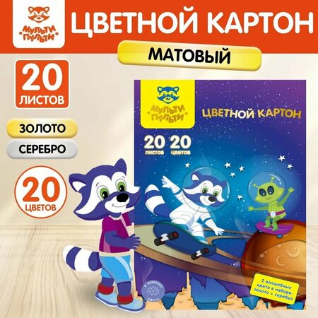 Цветной картон для творчества и оформления Мульти-Пульти "Енот в космосе. Волшебный" 20 листов А4 (20 цветов)