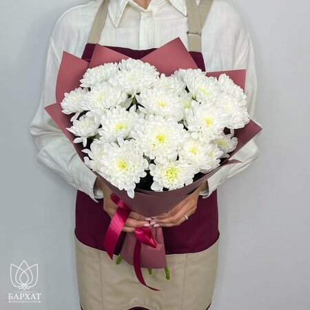 Букет из хризантем "Нежная улыбка" — это воплощение нежности и светлых чувств. Пять белоснежных хризантем с крупными, пушистыми соцветиями собраны в аккуратный монобукет высотой 50 см, оформленный в стильную флористическую бумагу и перевязанный лентой. Этот букет живых цветов создан для искренних моментов: он уместен на день рождения, юбилей, в качестве знака внимания без повода или как букет хризантем в подарок маме, бабушке, коллеге или любимой женщине. Белые хризантемы — символ чистоты, благодарности и уважения. Их выбирают, когда хочется сказать “спасибо”, “я рядом”, “ты важна для меня” — без лишних слов. Это красивый букет из хризантем, который не требует дополнительного декора: всё внимание — на естественную красоту живых цветов. Мы отбираем только свежие хризантемы, чтобы композиция сохраняла форму и стойкость до 7 дней. Каждый букет цветов хризантемы дополняется карточкой-инструкцией по уходу за цветами — это продлевает их жизнь и помогает получателю дольше наслаждаться ароматом и видом букета. "Нежная улыбка" — это красивый букет цветов, сдержанный по стилю, но наполненный смыслом. Он подойдёт тем, кто ценит деликатность, естественную элегантность и заботу, выраженную в деталях.
