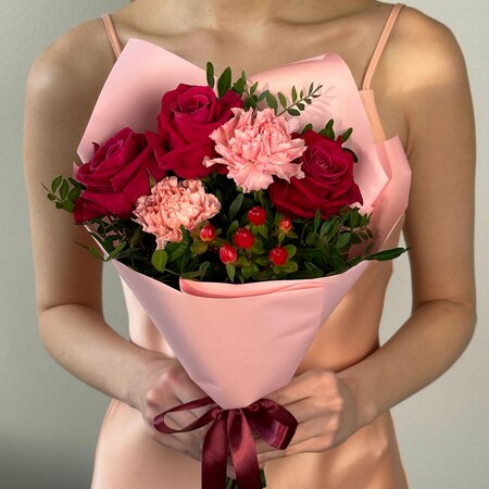 Букет из красных роз, нежно-розовых гвоздик и гиперикума — это элегантная и утончённая композиция, наполненная теплом и страстью. Роскошные красные розы являются главным акцентом, символизируя любовь, страсть и искренние чувства. Их глубокий оттенок гармонично сочетается с нежными гвоздиками, лепестки которых создают ощущение воздушности и лёгкости. Гиперикум с его изящными ягодками добавляет букету особую фактурность и объём, а свежая зелень в мягких тонах подчёркивает естественную красоту композиции. Этот букет станет прекрасным выбором для самых разных случаев — от романтического признания и годовщины до комплимента без повода. Его утончённые оттенки и изысканное сочетание текстур делают его стильным и запоминающимся подарком. Преимущества букета — в его свежести и стойкости. Красные розы радуют своей насыщенной палитрой, гвоздики славятся длительной свежестью, а гиперикум придаёт композиции особое очарование. Чтобы цветы дольше сохраняли свою красоту, меняйте воду в вазе каждые 2 дня, подрезайте стебли под углом и держите букет в прохладном месте, избегая прямых солнечных лучей. Используйте кризал, который мы заботливо положили в конверт с открыткой. В подарок идёт открытка, на которой вы можете написать Ваше пожелание получателю, это отличная возможность персонализировать подарок и сделать его еще более запоминающимся. Напишите нам в комментарии к заказу свои пожелания, а мы позаботимся обо всем остальном! ️ Обращаем ваше внимание, что оттенок цветов и упаковки может отличаться от примеров на фото, но мы обязательно сохраним общую цветовую гамму букета.