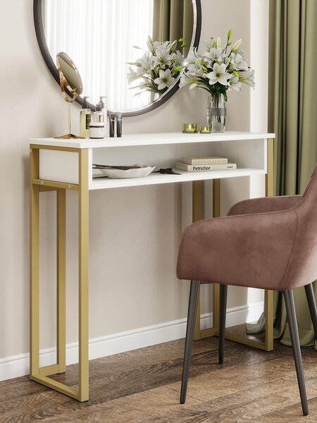 Туалетный столик без ящика KM LOFT: элегантный и функциональный Туалетный столик KM LOFT представляет собой стильное и функциональное решение для вашего интерьера. Он сочетает в себе элегантность и практичность, позволяя использовать его в различных помещениях, таких как спальня, рабочий кабинет, детская или прихожая. Компактный размер и удобная полка Туалетный столик имеет небольшие размеры (длина 90 см, ширина 31 см), что позволяет легко вписать его в любое пространство, не занимая много места. Удобная полка-ниша обеспечивает дополнительное пространство для хранения различных предметов. Прочный металлический каркас и ЛДСП столешница Туалетный столик изготовлен из прочного металлического каркаса с порошковой окраской и столешницы из ЛДСП. Это гарантирует долговечность и надежность изделия. Туалетный столик доступен в различных цветовых вариантах, что позволяет подобрать его под любой интерьер. Легкая сборка и металлические опоры Туалетный столик оснащен открытой полкой и металлическими опорами, что обеспечивает удобство и легкость сборки. Туалетный столик KM LOFT – это стильное и функциональное решение для создания уютного уголка в вашем доме.