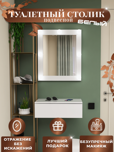 Туалетный столик с зеркалом и подсветкой станет незаменимым помощником каждой красавицы - почувствуйте себя звездой Голливуда! Гримерный стол с зеркалом с подсветкой - неотъемлемый и практичный атрибут для каждой любящей себя девочки, девушки, женщины. Косметический столик с зеркалом и ящиками– это удовольствие от наведения красоты и макияжа. Садясь за свой гримерный столик, включая свет на зеркале, озаряющее Ваше лицо, Вы мгновенно примеряете на себя роль голливудской дивы! Косметический столик-не просто подарок, а вклад в отличное настроение на весь день, раскрытие потенциала визажиста, стилиста. Это именно то, что придаст уверенности в подготовке к важным событиям. Поверхность туалетного столика с зеркалом легко очищается от пыли и загрязнений с помощью немного влажной тряпки, потому что имеет матовую поверхность. Отсутствие ручки на туалетном столике с зеркалом придаёт минимализм косметическому столику и экономит пространство, а система скрытой электрики полностью безопасна, скрыта от детей и домашних животных. Отличное решение для семей с детьми. Косметический стол идеальное решение для тех, кто не просто создает красоту, а вдохновлен процессом ухода и получением удовольствия от этого. Продуман до мелочей: учли потребности современности в организации пространства и экономии Вашего времени. Вам не придется больше тратить время на поиск нужного продукта, Туалетный столик для макияжа с зеркалом имеет вместительную нишу - храните косметические продукты, кисти, аксессуары, и даже ноутбук. Для удобства организации места рекомендуем приобретать органайзеры для ящика. Взгляните на свое отражение без искажений-главное преимущество наших зеркал производство AGG Europe. Гримерное зеркало с лампочками выдаёт мягкий и яркий нейтральный свет-важный аспект идеального макияжа. в любое время суток и при любых условиях освещения, при этом не раздражает глаза, и подходит для людей с плохим зрением. Сетевой шнур с вилкой имеет длину 1, 5 метра, этого достаточно, чтобы было удобно подключить питание от розетки даже на большом расстоянии, питание 220W. Стильный и практичный гримерный столик с зеркалом впишется абсолютно в любой интерьер. Зеркало с подсветкой в сборе, Вам останется только закрепить его на стену, либо просто поставить на туалетный столик. Туалетный столик подвесной, в комплект кладем специальный крепеж. Покупка — хороший вклад в интерьер спальни или гардеробной комнаты, если ваша квартира такой располагает. Наша продукция изготовлена из высококачественных экологичных материалов. Покупая мебель у нас, Вы покупаете напрямую у производителя- мы в инструкции по сборке, всегда поддерживаем своих покупателей и даже заменим разбитые доставкой детали! Комплектация: Зеркало. Консоль. Провод с вилкой. Комплект крепежа для навески. Зеркало в сборе, консоль в разобранном виде с комплектом крепежа. Лампочки В комплект НЕ входят! Рекомендуем к установке светодиодные лампы шар матовый Е14 мощностью от 4, 5 до 7 Вт, в зависимости от того, какая нужна яркость