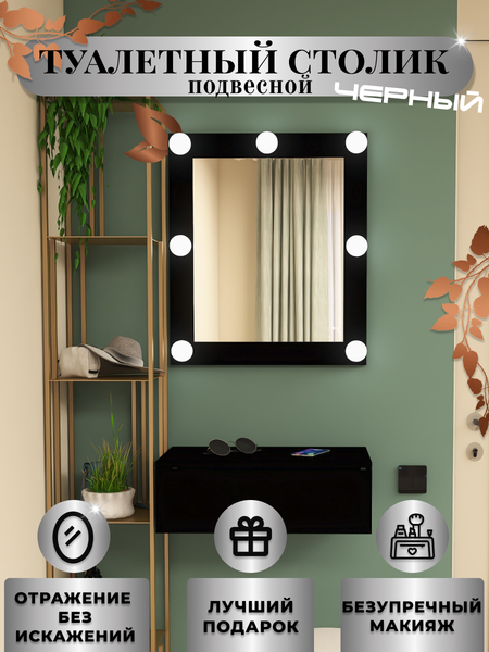 Туалетный столик с зеркалом и подсветкой станет незаменимым помощником каждой красавицы - почувствуйте себя звездой Голливуда! Гримерный стол с зеркалом с подсветкой - неотъемлемый и практичный атрибут для каждой любящей себя девочки, девушки, женщины. Косметический столик с зеркалом и ящиками– это удовольствие от наведения красоты и макияжа. Садясь за свой гримерный столик, включая свет на зеркале, озаряющее Ваше лицо, Вы мгновенно примеряете на себя роль голливудской дивы! Косметический столик-не просто подарок, а вклад в отличное настроение на весь день, раскрытие потенциала визажиста, стилиста. Это именно то, что придаст уверенности в подготовке к важным событиям. Поверхность туалетного столика с зеркалом легко очищается от пыли и загрязнений с помощью немного влажной тряпки, потому что имеет матовую поверхность. Отсутствие ручки на туалетном столике с зеркалом придаёт минимализм косметическому столику и экономит пространство, а система скрытой электрики полностью безопасна, скрыта от детей и домашних животных. Отличное решение для семей с детьми. Косметический стол идеальное решение для тех, кто не просто создает красоту, а вдохновлен процессом ухода и получением удовольствия от этого. Продуман до мелочей: учли потребности современности в организации пространства и экономии Вашего времени. Вам не придется больше тратить время на поиск нужного продукта, Туалетный столик для макияжа с зеркалом имеет вместительную нишу - храните косметические продукты, кисти, аксессуары, и даже ноутбук. Для удобства организации места рекомендуем приобретать органайзеры для ящика. Взгляните на свое отражение без искажений-главное преимущество наших зеркал производство AGG Europe. Гримерное зеркало с лампочками выдаёт мягкий и яркий нейтральный свет-важный аспект идеального макияжа. в любое время суток и при любых условиях освещения, при этом не раздражает глаза, и подходит для людей с плохим зрением. Сетевой шнур с вилкой имеет длину 1, 5 метра, этого достаточно, чтобы было удобно подключить питание от розетки даже на большом расстоянии, питание 220W. Стильный и практичный гримерный столик с зеркалом впишется абсолютно в любой интерьер. Зеркало с подсветкой в сборе, Вам останется только закрепить его на стену, либо просто поставить на туалетный столик. Туалетный столик подвесной, в комплект кладем специальный крепеж. Покупка — хороший вклад в интерьер спальни или гардеробной комнаты, если ваша квартира такой располагает. Наша продукция изготовлена из высококачественных экологичных материалов. Покупая мебель у нас, Вы покупаете напрямую у производителя- мы в инструкции по сборке, всегда поддерживаем своих покупателей и даже заменим разбитые доставкой детали! Комплектация: Зеркало. Консоль. Провод с вилкой. Комплект крепежа для навески. Зеркало в сборе, консоль в разобранном виде с комплектом крепежа. Лампочки В комплект НЕ входят! Рекомендуем к установке светодиодные лампы шар матовый Е14 мощностью от 4, 5 до 7 Вт, в зависимости от того, какая нужна яркость
