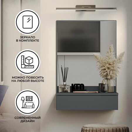 Туалетный столик от Кео выполнен в элегантном и минималистичном дизайне. Подходит для таких помещений, как спальня, детская комната или прихожая. У косметического столика, помимо большого зеркала, есть эргономичный выдвижной ящик. В нем хранят аксессуары, туалетные принадлежности и прочие мелочи. На нее ставят шкатулки, органайзеры, предметы декора. Большое прямоугольное зеркало расположено над столешницей. Визуально увеличивает пространство. Навесы, находящиеся за выдвижным ящиком и зеркалом, позволяют скрыть крепежные элементы, придавая столу завершенный и аккуратный вид. Крепления, которые гарантируют надежную фиксацию мебели на стене, поставляются в комплекте. Разместить столик для макияжа можно на любой высоте. Подвесной туалетный столик, кроме спальни, используется в детской комнате для хранения украшений и принадлежностей ребенка. В прихожей выполняет роль практичного места для размещения ключей, перчаток и вещей, которые нужны под рукой при выходе из дома. Поверхность не требует особого ухода. Размеры и допустимая нагрузка: Основные размеры настенного туалетного стола 736х500х350 мм Зеркало 545х490 мм Ширина столешницы под зеркалом 500 мм, глубина 334 мм Внутренние параметры выдвижного ящика 75х410х234 мм Выдвижной ящик рассчитан на вес до 3 кг Столешница выдерживает до 5 кг Общая нагрузка на туалетный столик до 8 кг Преимущества изделия Современный внешний вид Зеркало в комплекте Можно повесить на любой высоте Удобный выдвижной ящик Скрытые крепления к стене Надежная фурнитура Простая сборка Изготовлен из безопасного ЛДСП толщиной 16 мм, класс безопасности ЛДСП Е1 Сочетается с мебелью от Кео