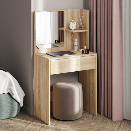Туалетный стол деревянный станет настоящим украшением вашей спальни или гостиной, обеспечивая комфортное место для ухода за собой. Столик оснащен зеркалом, которое крепится к верхней части изделия, предоставляя вам идеальный обзор во время нанесения макияжа и укладки волос. Одним из ключевых преимуществ этого туалетного столика является удобный выдвижной ящик, оснащенный роликовыми направляющими. Он идеально подходит для хранения косметики, аксессуаров и других личных вещей, сохраняя порядок и доступ к необходимым предметам. Дополнительная открытая полка позволяет держать все необходимые мелочи под рукой. Туалетный столик прекрасно сочетается с другими предметами мебели в доме, добавляя уюта и комфорта в любой интерьер. В конструкции стола предусмотрена царга, именно благодаря ей столик устойчивый. Изготовлен туалетный стол из безопасного ЛДСП толщиной 16 мм, класс безопасности Е1. Цвет стола – дуб сонома. Текстура дуба отличается уникальным оттенком и имеет особый выраженный узор, придающий интерьеру шарма и элегантности. При сборке и установке рекомендуется закрепить туалетный стол к стене креплениями, которые идут в комплекте. Размеры и допустимая нагрузка: Размер зеркала 440 х 390 мм (идет в комплекте); Внутренние размеры выдвижного ящика 560х334х100 мм; Высота туалетного стола 1260 мм (учитывая верхнюю часть стола с зеркалом); Допустимая нагрузка на столешницу до 20 кг, нагрузка на выдвижной ящик и открытую полку до 5 кг. Преимущества изделия: