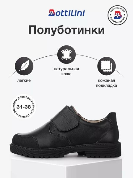 Детские школьные полуботинки в классическом стиле изготовлены из натуральной кожи, которая обеспечивает оптимальный воздухообмен, чтобы нога не потела и не уставала, даже после длительной носки. Уникальные качества натуральной кожи обеспечат комфортную индивидуальную посадку по ноге всего после нескольких прогулок. Благодаря широкой раскрываемости и удобной регулировки полноты за счёт застёжки-липучки школьные туфли для мальчика подойдут как на узкую и стандартную ножки, так и на высокий/полный подъём. Детские школьные полуботинки на липучке – это идеальное сочетание качества, комфорта, стиля и универсальности в одной паре обуви. Туфли имеют задник средней жесткости и комфортную колодку, благодаря этому нога зафиксирована в правильном положении, нагрузка на стопу и опорно-двигательный аппарат распределяются равномерно, что позволяет ребенку чувствовать удобство при ходьбе, беге в школе, а также на прогулках. Удобная застёжка – липучка дарит простоту при надевании и обеспечивает плотную фиксацию стопы. Небольшой каблук разгружает позвоночник и способствует здоровью стопы. Профилированная стелька с подсводником (супинатором) средней высоты и жесткости обеспечивает профилактику плоскостопия. Упругая и эластичная подошва из материала ТЭП (Термоэластопласт) очень прочная и износостойкая, обеспечивает оптимальный перекат, правильно распределяет нагрузку на стопу и не оставляет следов на полу. Школьные туфли из натуральной кожи BOTTILINI – это универсальный вариант обуви на любой случай жизни, будь то праздничная линейка, сменка в школу, обувь для повседневной носки или для любого праздничного образа и торжества. Благодаря классическим сочетаниям цветов школьные полуботинки прекрасно впишутся в любой гардероб. Туфли Bottilini — это гарантия высокого качества натуральных материалов, максимальный комфорт и доступная цена. Классический силуэт школьных полуботинок подойдет как детям, так и взрослый, это прекрасная возможность подобрать уникальный семейный образ.