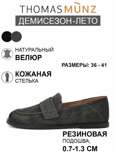 Лоферы женские замшевые из велюра КРС летние и демисезонные с круглым носом выполнены на тонкой подошве 0,7 см и низком каблуке 1,3 см. Классические туфли с закрытым носом и закрытой пяткой комфортны для улицы и в помещении. Кожаные натуральные туфли на квадратном каблуке комфортны как основная и вторая обувь на осень лето для работы, как вечерние и праздничные туфли для танцев. Красивые классические лоферы на устойчивом каблуке весна лето удобны как сменная обувь для офиса и в школу на зиму и выпускной. Такая рабочая офисная и школьная обувь на толстой подошве для взрослых женщин и подростков девушек обеспечивает комфорт. Легкие школьные, танцевальные или повседневные молодежные лоферы для девочки подростка выглядят стильно. Модные темные осенние и весенние женские и подростковые закрытые туфли на платформе небольшой высоты демисезон лето легко комбинируются с нарядной одеждой, идут под платье и брюки. Стильные дышащие лоферы на небольшом каблуке классика удобны как сменка, заменяют короткие ботинки, офисные лодочки, полуботинки дерби на толстом каблуке. Эта удобная весенняя и осенняя обувь для девушек и женщин может подойти как свадебные балетки для подружек невесты на свадьбу и девичник. Модель на широком каблуке удобна для ходьбы и в машину, для мамы и бабушки. Серые лоферы на черной подошве и невысоком каблуке дополнены качественной фурнитурой и деталями в стиле мокасины. Изготовлены брендовые лоферы из натурального велюра КРС серого цвета, мягкого и дышащего, как замша. Подкладка и стелька из натуральной кожи коричневого цвета. Стелька с эффектом памяти Munz Memory препятствует усталости ног. Подошва из резины износостойкая, с высокими противоскользящими свойствами. Каблук моноблок надежный, литой с подошвой. Высота голенища 5,5 см. Женская обувь Томас Мюнц полноты 4 комфортна на узкую ногу и средней полноты, не склонную к отеканию. Температурный режим для комфорта ног не ниже плюс 5. Вес пары около 560 гр. Размерную сетку см. в фотографиях.