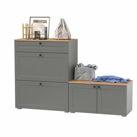 состоит из тумбы и обувницы; 1 ящик, 2 откидные дверки, 2 распашные дверки, 2 полки; скрытые направляющие выдвижных ящиков; двери оснащены четырехшарнирными петлями без доводчиков; регулируемые опоры; лицевая фурнитура в виде черных аккуратных ручек на фасадах