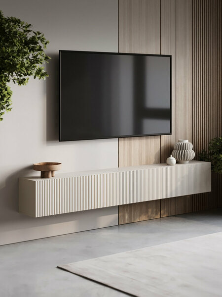 Стильная парящая тумба под ТВ впишется в стиль арт-деко, бохо