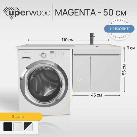 Тумба под раковину Uperwood Magenta для установки со стиральной машиной представляет собой функциональное, надежное и практичное решение, которое отлично впишется в любой современный интерьер ванной комнаты. Элегантный минималистичный дизайн тумбы дополняет ее безупречная матовая поверхность. Фасад и боковые стенки изделия выполнены из МДФ толщиной 16 мм. Покрытие тумб - Soft touch. Коллекция тумб Uperwood Magenta представлена подвесными и напольными моделями в 3 цветовых решениях: белый матовый, черный матовый и белый матовый с графитовыми вставками. У напольных тумб Magenta 2 распашные дверцы, одна из секций оснащена полкой. Подвесные тумбы Magenta имеют выдвижной ящик, который изготовлен из влдсп и оснащен доводчиками премиум-класса. Подвесные тумбы Magenta также представлены моделями с двумя распашными дверцами. Размерный ряд тумб под раковину Magenta представлен моделями 60 см и 50 см (фактическая ширина 55 см и 45 см). Для тумб Uperwood Magenta 60 см подходит раковина Uperwood Magenta 120 см (с правой чашей арт. 2490000009; с левой чашей арт. 2490000010). Для тумб Uperwood Magenta 50 см подходит раковина Uperwood Magenta 110 см (с правой чашей арт. 2490000011; с левой чашей арт. 2490000012). Тумба может быть установлена как с правой, так и с левой стороны относительно стиральной машины в зависимости от положения чаши раковины. "Крыло" раковины Uperwood Magenta располагается над стиральной машиной. Тумба поставляется в собранном виде, в комплект входит крепеж для подвесного монтажа или ножки для напольного монтажа тумбы.