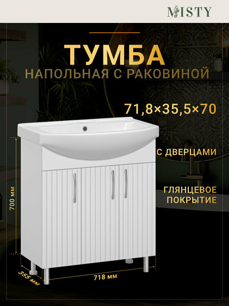 Бренд Misty известен на отечественном рынке уже более 18 лет. Компания производит мебель для ванных комнат, используя качественные влагостойкие материалы, благодаря чему гарантийный срок службы продукции составляет 10 лет. Дополнительную защиту корпуса обеспечивают несколько слоев итальянской эмали. Мебель Misty предлагает своим клиентам широкий ассортимент продукции в различных ценовых сегментах: Люкс, Премиум и Эконом. В каждой ценовой нише представлены коллекции разных стилей - от классики до модерна, что позволит создать свой неповторимый стиль ванной комнаты. Предлагаем Вашему вниманию Комплект Misty Изео - 75 Тумба напольная прямая, пленка + раковина. Габариты (ШГВ), см: 72х36х70. Материал: ЛДСП, МДФ. Расположение: напольная. Система хранения: с дверцами, с полками. Комплектуется раковиной Днепрокерамика Изео 75