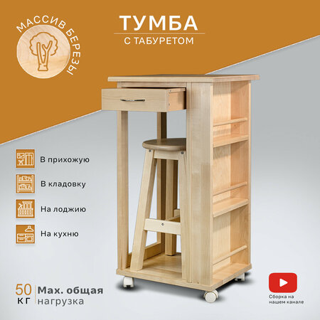 Комплект из тумбы и табурета изготовлен из натурального дерева, массива берёзы. Дизайн предметов мебели без декоративных элементов лаконичен. Столешницу и сидение объединяет белый цвет. Набор подойдёт под интерьер в скандинавском, эко стилях. Тумба имеет оптимальную высоту. Она будет полезна на кухне. Размещайте на полочках специи и масло, а в выдвижной ящик убирайте столовые приборы. Мобильная мебель не помешает Вам при уборке. Тумба с табуретом пригодятся во время барбекю на дачной или садовой террасе. Пищевые добавки и напитки будут под рукой на полках. На столешнице можно нарезать продукты, смешивать соусы. Маленькая тумбочка подойдёт для коридора. Сочетайте её в прихожей со шкафом или комодом. На полочки тумбы можно поставить средства для ухода за обувью, а ящик использовать для хранения ключей и других небольших вещей.