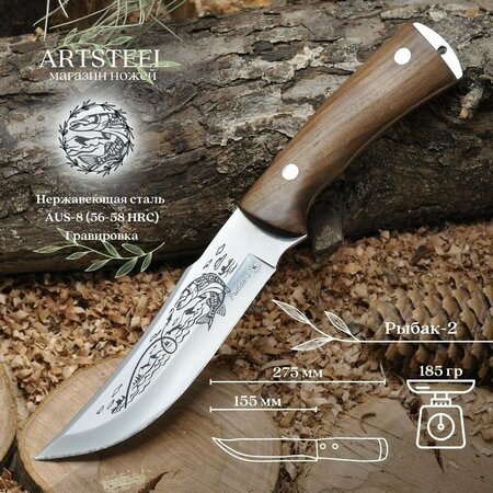 ООО ПП Кизляр - это известный Российский производитель высококачественных ножей. В ассортименте бренда можно найти различные модели ножей, включая туристические ножи, охотничьи и рыбацкие ножи, ножи для выживания и многое другое. Клинок туристического ножа Рыбак-2 выполнен из японской нержавеющей стали AUS8. Сталь обладает оптимальным соотношением гибкости и твердости в 56-58 HRC, отличными режущими свойствами, высокой коррозионной стойкостью и устойчивостью к механическим повреждениям. Ножи с клинками из AUS-8 не требуют частой заточки, для них пригодны большинство марок абразивов и подручных средств, не требующих специальных навыков. Форма клинка Persian славится своей элегантностью и визуальной привлекательностью. Изогнутая форма делает его неповторимым и интересным для коллекционеров и любителей ножей. Благодаря характерной форме спусков, ножи с вогнутой линзой прекрасно подходят для вспарывания шкуры и разделки мягких тканей, что делает их идеальными для работ с материалами, требующими точного и контролируемого разреза. Художественное оформление позволяет каждому ножу стать уникальным произведением искусства, отражающим индивидуальность и стиль владельца. Ореховая рукоять охотничьего ножа Рыбак-2 имеет гладкую и приятную на ощупь поверхность, обеспечивает удобный захват и позволяет комфортно и уверенно держать нож. Конструкция: половины рукояток с помощью штифтов скреплены с клинком. В комплекте поставляется чехол из натуральной кожи с подвесом на ремень, обеспечивающий безопасность и удобство хранения и транспортировки ножа. Благодаря своей универсальной конструкции и прочному клинку, нож Рыбак-2 отлично подходит для решения задач на природе, таких как разделка мяса, рыбалка, бушкрафт. Его надежность и острота позволяют справляться с различными задачами с легкостью. Рыбак-2 станет прекрасным подарком для мужчины, увлеченного активным отдыхом, любителя приключений. Функциональность, стильный внешний вид и качество изготовления ножа делают его идеальным выбором для тех, кто ценит надежное и профессиональное снаряжение. Не относится к холодному оружию, сертификат прилагается. Разрешено свободное хранение и ношение.