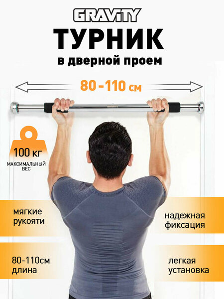 Турник дверной Gravity — это эффективный спортивный снаряд, который позволит вам поддерживать себя в форме, не выходя из дома. Он не занимает много места в квартире, но дает возможность выполнять разнообразные упражнения на различные группы мышц. Плюсы от наличия турника дома: – Укрепление мышц спины и рук. Подтягивания, висы и другие упражнения на турнике задействуют широчайшие мышцы спины, бицепсы, предплечья и плечи. – Увеличение гибкости. Выполняя упражнения на турнике, вы улучшаете подвижность суставов и повышаете общий тонус организма. – Снижение риска заболеваний спины. Турник помогает укрепить мышечный корсет, снимает напряжение с позвоночного столба и снижает риск возникновения грыж, протрузий и других проблем. – Развитие координации и силы хвата. Упражнения на турнике требуют хорошей координации движений и развивают силу хвата. Преимущества турника дверного Gravity: * Универсальность. Турник можно установить в любом дверном проеме шириной от 80 до 110 см. * Надежность. Турник изготовлен из высокопрочной стали и выдерживает вес пользователя до 100 кг. * Простота установки. Монтаж турника не требует специальных инструментов. * Лаконичный дизайн. Черный цвет турника Gravity отлично впишется в любой интерьер.