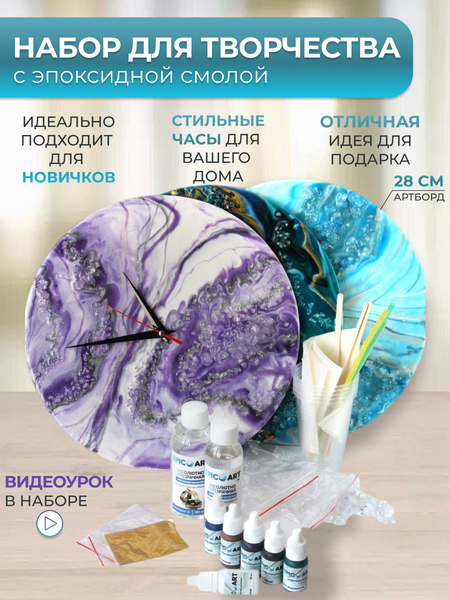 В наборе 1 артборд + все необходимое для создания часов! Творческий набор для создания интерьерной картины готовое решение для всех, кто хочет рисовать картины в технике Resin Art. Смола не имеет сильных запахов и безопасна для детей, если работать по инструкции, внимание дети должны работать только под присмотром взрослых. Эпоксидная смола для творчества в наборах станет оригинальным занятием для развития моторики у детей, также смола эпоксидная — это лучшее хобби и творчество для взрослых. Создание поделок из эпоксидки отлично подойдет для совместного творческого времяпрепровождения с ребенком и близкими. Ведь набор для рисования эпоксидной смолой это еще и очень увлекательное занятие. Смола для рукоделия поможет создать уникальные поделки для детей и взрослых, приводящие всех окружающих в восторг! В каждый набор вложена подробная и доступная инструкция по работе с эпоксидной смолой, поэтому всем будет легко и увлекательно работать с нашим набором для творчества. необычный и креативный подарок. Креативный набор будет оригинальным подарком, как для взрослого, так и для детей на день рождения, новый год на любой другой праздник и просто так. Приобретая набор, вы получаете все материалы для создания одной картины, вам не нужно приобретать никакие дополнительные товары. Дополнительно вам потребуется только обычный домашний фен и электронные весы. Набор для творчества включает различные аксессуары и материалы для рукоделия, такие как: Комплект смолы; Артборд 1 шт; пигмент золото 1 шт, серебро 1шт; краситель 6 шт Деревянные шпатели; коктейльные трубочки; Одноразовые стаканчики; Салфетки; Клиентка для защиты стола; Видео инструкция; Общая инструкция; Перчатки 1 пара; Стеклянная крошка 2 размера; Часовой механизм; Комплект стрелок. С таким набором эпоксидная смола для творчества досуг может стать приятнее и интереснее! Внимание! Использование весов обязательно. Сокращение времени жизни смеси, следствие не верной пропорции компонентов и нарушение температурного режима.