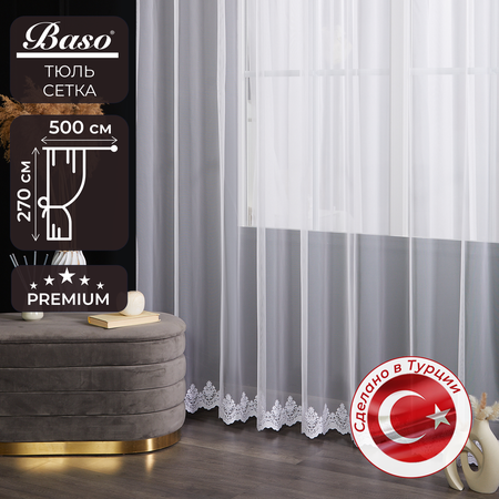 Тюль сетка Baso на шторной ленте с вышивкой / для гостиной, спальни, кухни / 270х500 см, 1 шт, белый, Турция