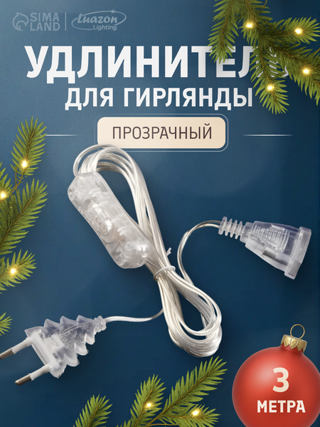 Удлинитель для комнатных гирлянд с выключателем, 3 м, прозрачная нить, УМС-вилка