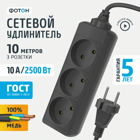 Корпус изготовлен из негорючего и ударопрочного пластика. Контактная группа изготовлена из латуни, что обеспечивает высокую электропроводность и максимально плотный контакт со штырями вилки подключаемых приборов. Гнездовые контакты расположены под углом для одновременного подключения нескольких приборов. Подходят для подключения штепсельных вилок российского и евростандарта. Провод ПВС – медная токопроводящая жила в двойной ПВХ изоляции. Характеризуется устойчивостью к нагреву и повышенной гибкостью. Сечение проводника 2 х 0,75 мм2 для моделей без заземления с макисмальной мощностью 2500 Вт. Безусловная гарантия 5 лет. Вся продукция полностью соответствуют нормам российского ГОСТ и EAC. Все удлинители и разветвители «фотон» проходят двойной контроль качества и работоспособности.