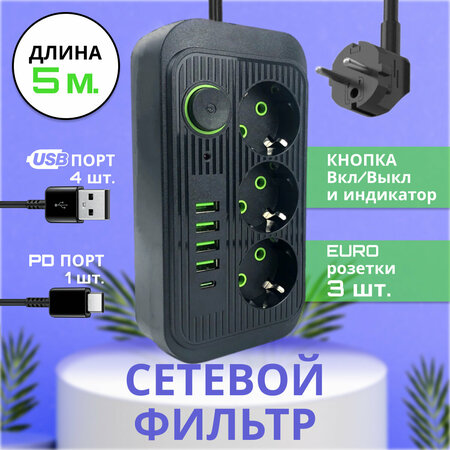 Сетевой удлинитель (без заземления) 3 евро-розетки, 4 USB портами+1 Type-C , с защитой для вашей техники от скачков напряжения сети и функцией зарядки для ваших гаджетов. Технология в тройнике позволяет автоматически выбирать оптимальную мощность, необходимую устройству при подключении через usb порт, который имеет силу тока до 3.4 А и автоматически регулируется, подбирая подходящую силу. Корпус кабеля с выключателем изготовлен из жаропрочного пластика, выдерживает температуру до 750 градусов, контакты изготовлены из меди. Обеспечивает безопасное подключение любой совместимой электротехники и способна работать при показателях переменного тока в пределах от 100 до 250 В. Длина удлинителя 5 метров. Номинальная мощность максимально 2500W/250V/10A.