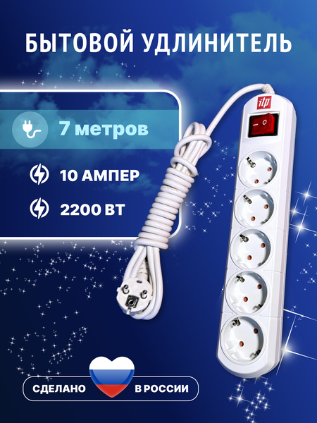 Надежный бытовой удлинитель на 5 розеток с заземлением. Длина шнура 7 метров. Провод ПВС 3*0,75 мм 10А. Подходит для дома, дачи и офиса. Выключатель со светодиодной индикацией. Корпус удлинителя изготовлен из ударопрочного самозатухающего ABS пластика. Мы думаем о безопасности Ваших детей, поэтому все наши изделия снабжены защитными шторками на розетках. Продукция имеет сертификаты соответствия EAC требованиям ТР ТС 004/2011 "О безопасности низковольтного оборудования", декларации соответствия EAC требованиям ТР ТС 020/2011 "Электромагнитная совместимость технических средств"и 037/2016 "Об ограничении применения опасных веществ в изделиях электротехники и радиоэлектроники". Модельный ряд включает удлинители 3, 4 и 5 розеток с сечением провода ПВС 0,75/1/1.5 током нагрузки на 10A и 16A, проводами 2/3/5/7 метров.