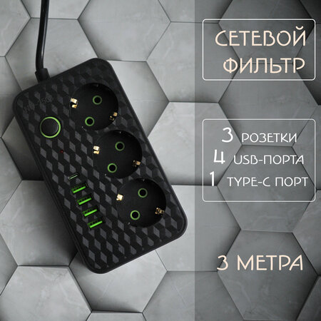 Сетевой фильтр , с 4 USB-портами, черный, 3 м \Универсальный удлинитель для дома 3 м 4 USB 1 Type-C, 3 гнезда