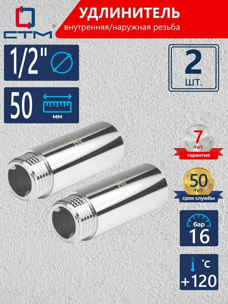 Удлинитель 1/2" г/ш x 50 мм CTM с внутренней/наружной резьбой предназначен для удлинения соединения. Удлинитель изготавливается из высококачественной горячепрессованной латуни и имеет хромированное покрытие, дающее дополнительный запас прочности. Хромированное покрытие предотвращает появление коррозии, а также защищает от механического износа и вредного воздействия агрессивных жидкостей и воздушно-газовых сред. Резьба удлинителя нарезается на станке с ЧПУ. Материал: латунь с хромированным покрытием Резьба: внутренняя/наружная Давление: 16 бар Рабочая температура: от -20°С до +120°С
