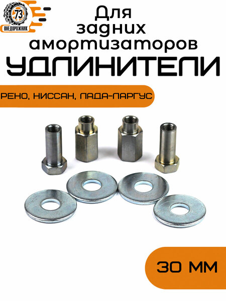Величина «лифтовки» ( высота проставок) - 30 мм Комплект предназначен для установки в заднюю подвеску автомобилей: рено логан (LS) (Фаза 1, Фаза 2) рено логан 2(L8) (2014 г.) рено сандеро (BS) рено сандеро 2 (2014 г.) рено дастер ( HSA, HSM) ниссан альмера (G15) ниссан террано 3 (D10) лада ларгус DACIA LOGAN Express (FS) DACIA LOGAN MCV (KS) DACIA LOGAN Pickup (US) DACIA DOKKER DACIA LODGY Комплект предназначен для увеличения длины амортизаторов при «лифтовке» задней подвески. И будет интересен: - тем, кто уже имеет отдельно проставки другого производителя; - тем, кто производит "лифтовку" задней подвески пружинами с другими характеристиками, отличными от штатных (более длинные, более жесткие пружины). Состав комплекта: Проставка амортизатора (Сталь. Оцинковка) - 2 шт. Удлинитель штока амортизатора ( Сталь. Оцинковка) - 2 шт. Шайба 12х35 - 4 шт
