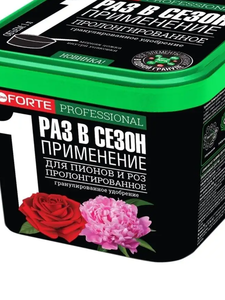 ✿УСКОРЯЕТ РОСТ И развитие растений В 1,5 - 2 раза. Стимулирует длительное И пышное цветение. Уникальный состав С высоким содержанием кремния. Гранулированное пролонгированное премиум удобрение Bona Forte для пионов и роз с биодоступным кремнием произведено по уникальной технологии SIIOG. Удобрение содержит основные элементы питания в легкоусвояемой форме и сбалансированном соотношении, способствует хорошему росту растений и пышному цветению. Преимущества: Равномерное внесение - благодаря содержанию всех компонентов в одной грануле растение гарантированно обеспечивается каждым элементом питания. Пролонгированное действие - благодаря входящему в состав удобрения цеолиту питательные вещества высвобождаются постепенно и усваиваются растениями по мере потребности (одно внесение на сезон!). Хорошая растворимость - удобрение начинает действовать моментально. Экономичное расходование - благодаря гранулам можно с высокой точностью вносить удобрение и подкармливать растения. Как использовать: Основное внесение – удобрение равномерно рассыпают по поверхности почвы и проводят вспашку или перекопку, или рыхление. При посеве и посадке – при посадке саженцев удобрение перемешивают с почвой, вынутой из посадочной ямы. Подкормки – удобрение равномерно распределяют между рядами растений (в междурядьях) или по поверхности почвы с последующей заделкой удобрений рыхлением. После подкормок растения рекомендуется обильно полить. Пионы, розы и цветочно-декоративные культуры - подкормка через 2 недели после появления всходов или высадки рассады. Удобрение пролонгированное - подкормка производится 1 раз за сезон. Дополнительная информация: Расход одного ведра: • при основном внесении: до 20 м² • при подкормке: до 40 м² После окончания срока годности удобрение не теряет агрономической ценности. Мерная ложка внутри упаковки – 40 г Мера веса удобрения Bona Forte Пролонгированное (ориентировочно): чайная ложка – 5 г, столовая ложка – 15 г. состав: Три основных макроэлемента (NPK): азот (N) - 5 %, фосфор (P2O5) - 13 %, калий (K2O) - 13 % Si: биодоступный кремний - 20%. Мезоэлементы: магний - 0,3 %, кальций - 0,25 %. Шесть микроэлементов: бор, железо, марганец, цинк, медь, молибден. Микроэлементы находятся в хелатной (легкоусваиваемой) форме. Комплекс витаминов: B1, В6, В12, PP, С Стимулятор роста: янтарная кислота. Товар сертифицирован. Произведено в России. Объем 1 л.