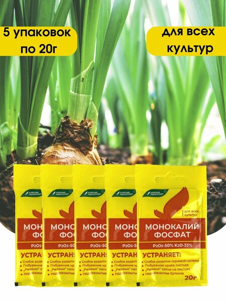 Растворимое в воде удобрение монокалийфосфат (монофосфат калия) - идеальное решение для любых культур. Поставляется монокалийфосфат в упаковке 20 г. Главными элементами являются калий и фосфор. Калий позволяет активизировать процессы обмена азотом и углеводами. Фосфор способствует плодам стать более вкусными и крупными. Удобрение Монокалий фосфат используется в качестве подкормки растений в защищенном и открытом грунте. Его можно использовать на протяжении всего вегетационного цикла жизни растения: от высаживания рассады, до пересадки растения в теплицу или в открытый грунт. После внесения повышается качество и количество урожая, продлевается время цветения, увеличивается сохранность и свойства, необходимые для зимовки. По своему внешнему виду подкормка представляет собой кристаллический порошок белого оттенка, который хорошо и без осадка растворяется в воде. Состав: P2O5 (%):50, K2O (%):33. Срок использования не ограничен. Комплексное минеральное удобрение Монокалий фосфат или монофосфат калия является универсальным. Удобрение можно применять как для внекорневой подкормки (опрыскивание), так и для прикорневой (вносить вместе с поливом). Также можно заменить слабым раствором удобрения воду для капельного полива и гидропоники. Монофосфат калия можно применять к овощным, декоративным, хвойным, плодово-ягодным культурам. Удобрение представляет собой минеральное средство, в основе которого химические соединения, необходимые для полноценного и сбалансированного питания растений. Монофосфат калия является одним из самых концентрированных фосфорнокислых удобрений. Его эффективность достигается за счет высокой усвояемости растениями химических чистых питательных веществ. Внесение монофосфата калия повышает урожайность и улучшает качество плодов и овощей за счет лучшего накопления сахаров и витаминов, повышают их сохранность при хранении и сбалансированное содержание крахмала и сахаров. Удобрение монокалийфосфат от производителя "Буйские удобрения" - имеет комплексный состав из самых важных элементов, которые не дают растению болеть. Монофосфат калия предназначен для выращивания: огурцов, томатов, перца, рассады чеснока и лука. Хорошо показало себя удобрение и при выращивании цветочных культур: роз, петуний и комнатных цветов.