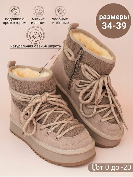 Достоинства:Теплые,качественные,милые. Цвет то,что нужно. Недостатки:Возможно тяжелые. Но это на мой взгляд, дети не жаловались) Комментарий:Очень хорошенькие угги. Дети их обожают. Внутри натуральная шерсть, снаружи плотная натуральная замша.Форму держат.