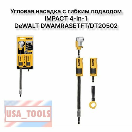 В отличии от DT20501 в этот набор добавлена прямой удлинитель для угловой насадка. Таким образом можно получить 4 комплекта - гибка насадка, гибкая угловая насадка, компактная угловая насадка, угловая насадка. Гибкий бито держатель с гибкостью 180° для сверления и заворачивания крепежа в ограниченных местах и труднодоступных пространствах. Хвостовик HEX 1/4'. Фирменный замок Metal Gear с быстрым извлечением бит. Надежная долговечная запатентованная антивибрационная конструкция - снижает уровень вибраций на руку пользователя для дополнительного контроля и комфорта работы, при этом обеспечивает полноценную передачу крутящего момента от инструмента. Насадка поставляется в фирменной блистерной упаковке. Особенности: