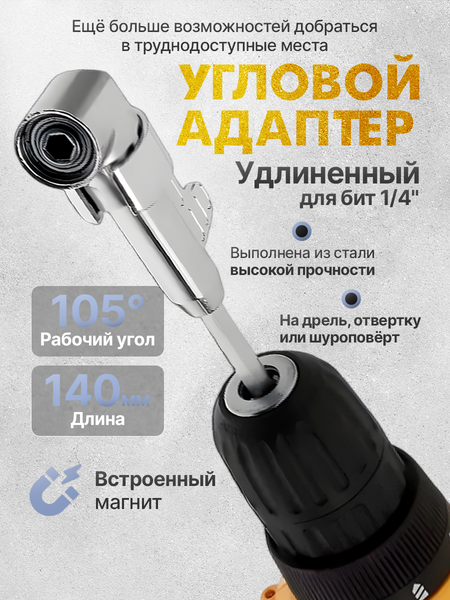 Угловая насадка на шуруповерт, угол поворота (передачи) усилия 105 градусов, предназначен для работы в труднодоступных местах, где обычная отвертка или аккумуляторная отвертка не подходят. Бита для шуруповерта устанавливается в пазы, насадки на шуруповерт, и удерживается за счет магнита, установленного в корпусе, насадки для шуруповерта. Магнитные биты дополнительно усиливают фиксацию бит в, насадки на шуруповерт . Могут использоваться биты для шуруповерта: прямая бита, шестигранная бита, бита звездочка или обычная крестовая бита под шуруповерт. Насадка для шуруповерта, переходник на дрель имеет шестигранный хвостовик. Посадочное место, угловой адаптер для шуруповерта, также имеет шестигранную форму. Угловой адаптер для дрели поможет закрутить шуруп, гайку или сделать отверстие сверлом в стесненных условиях, когда невозможно использовать дрель или сверлильный станок. Насадка на дрель, полезное дополнение к оснастки строительного инструмента, такого как: угломер, шаблон для сверления, шаблон для плиточника и каменщика. Для хранения и переноса, адаптер для шуруповерта, подойдет строительная сумка или ящик для инструментов. Также, адаптер для шуруповерта, можно добавить в существующий набор инструментов для ремонта и домашнего использования. Купить угловой адаптер для шуруповерта, для шуруповерта, - правильное решение, когда работы ведутся в труднодоступных местах. Насадки на дрель, имеют разборную конструкцию, что позволяет выполнить дополнительную смазку внутренних элементов. Наборы насадок для шуруповерта, насадки для дрели, для бит могут иметь различную конструкцию: насадка на шуруповёрт, без ручки; насадка с держателем или переходник для бит с прямым углом. Угловой адаптер для шуруповерта, можно использовать как: угловая насадка на гравер; адаптер угловой для шуруповерта; угловая насадка на шуруповерт; угловой адаптер для бит; угловой адаптер для гравера; угловой адаптер для гайковерта; адаптер угловой для дрели. Особенности: 1: Насадка угловая – это дополнительная оснастка для шуруповертов. Предназначена для завинчивания шурупов в труднодоступных местах и в условиях ограниченного пространства. Теперь вместо того, чтобы искать подходящую короткую отвёртку, вам нужно всего лишь закрепить данную насадку на свой инструмент! 2: Корпус насадки изготовлен из прочной стали. 3: Магнит обеспечивает быструю и надёжную фиксацию биты. 4: Предназначен для дрелей, шуруповёртов под биты и держатели бит 1/4. 5: Угловая насадка используется с гайковертами и винтовертами с крутящим моментом максимум до 11 Нм и не более 400 об/мин.
