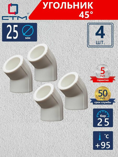 Набор 4 шт. Угол полипропиленовый 45 градусов DN 25 СТМ пласт предназначен для соединения полипропиленовой трубы под углом 45° друг к другу. Соединитель используется для подключения таких компонентов как краны, фильтры и другие фитинги систем водоснабжения и отопления. ПП трубы и фитинги применимы для горячей и холодной воды, напольного и радиаторного отопления. Монтаж полипропиленового трубопровода осуществляется методом раструбной сварки (свариваемые детали после разогрева вставляются друг в друга). Для этого необходимо использовать специальный сварочный аппарат и насадки для пайки. Изготавливается из полипропилена (Polypropylene random copolymer – полипропилен тип 3). Материал экологически безвреден и не выделяет вредных веществ при эксплуатации. Водопровод из полипропиленовых труб и фитингов не меняет вкус, запах и цвет протекающей жидкости. Максимальное рабочее давление 25 Бар. Максимальная температура рабочей среды +95С. Срок службы - до 50 лет.