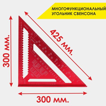Угольник столярный "Свенсона" 30х30 см- строительный инструмент который упростит множество операций при ремонте, строительстве, столярных или слесарных работах. Это многофункциональное устройство, позволяющее при помощи одного инструмента измерить расстояние, быстро отмерить и начертить угол, разметить кровлю, ровно отпилить доску и т. д. Строительный угольник Свенсона широко используется в деревообработке. Измерительный инструмент идеален при создании мебели, мебельных аксессуаров, контурных элементов, а также при деревообрабатывающих работах. Изготовлен из алюминия. Метрическая шкала (в мм.) выгравирована лазером и выкрашена в белый цвет, имеет высокую контрастность и износостойкость. Вы легко можете ориентироваться по меткам и не бояться их стереть. Наличие антибликового покрытия позволит видеть маркировку при любом освещении. Универсальное приспособление в категориях: инструменты и принадлежности, инструменты и оснастка, инструменты для ремонта, инструменты строительные, инструменты для мужчин. При помощи столярного угольника у вас легко получится отмерить любой угол от 1 до 90 градусов, проверить соблюдение прямого угла между соединениями, нанести перпендикулярные линии, определить и перенести углы различной сложности на поверхность изделий, определить угол лезвия циркулярной пилы. Боковой упор и крупные шкалы угольника повышают точность и легкость разметки при работе. Угольник так же легко использовать в качестве обыкновенной линейки или как трафарет. На передней части треугольной линейки также есть таблица быстрого преобразования, которая позволяет сэкономить время и повысить эффективность работы. Уголок строительный станет незаменимым помощником для профессионала и новичка в области строительства. Цвет угольника на выбор: красный Размер угольника: 300*300*425 мм