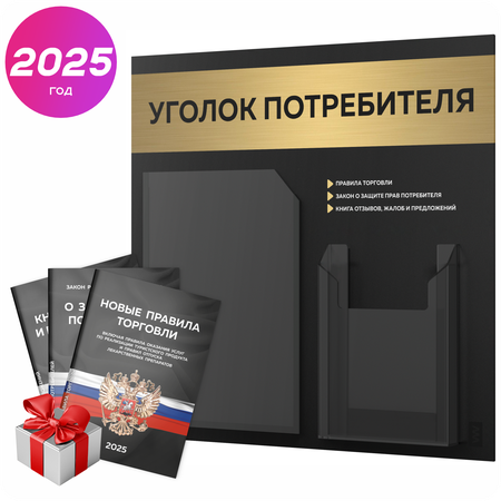 Стильный, современный и удобный информационный стенд Уголок потребителя от Айдентика Технолоджи. Настенный стенд Уголок Потребителя 2025 пришел на замену версии 2024 и 2023 года, стенд укомплектован самым новым и актуальным законодательством 2025 года, набор книг включает в себя все актуальные правки в законодательство. Стенд выполнен из качественного пластика с цветным оформлением элементов на ваш выбор, оснащен полным комплектом необходимых книг и нормативно-правовых актов. Большой выбор цветов и моделей стенда. Подойдет для любого интерьера магазина, кафе, фитнес-клуба, аптеки, салона красоты, автомойки, ногтевой и бьюти-студии, шиномонтажа, дома быта, магазина цветов и других точек продаж. Уголок потребителя подойдет для любой формы организации, как ИП так и ООО. Уголок покупателя Айдентика Технолоджи полностью отвечает требованиям Роспотребнадзора по защите прав потребителей. На стенде Уголок покупателя расположены: - 1 плоский карман для листа формата А4 (297х210мм). - 1 объемный карман для документов формата А5 (210х148мм). В объемном кармане располагаются: - Книга отзывов, жалоб и предложений: 1 шт. - Книга Правила торговли: 1 шт. - Закон о защите прав потребителей: 1 шт. Размеры стенда: 460 х 490 мм. (В х Ш) Материал конструкции: пластик 3 мм. Материал карманов: ПЭТ прозрачный и акриловое стекло. Сзади стенда нанесен крепкий профессиональный скотч для установки уголка потребителя на стену. Также предусмотрен альтернативный вариант крепления информационного стенда - саморезами. Саморезы и декоративные заглушки идут в комплекте с уголком потребителя. Ознакомьтесь также с другим торговым оборудованием и информационными указателями Айдентика Технолоджи.