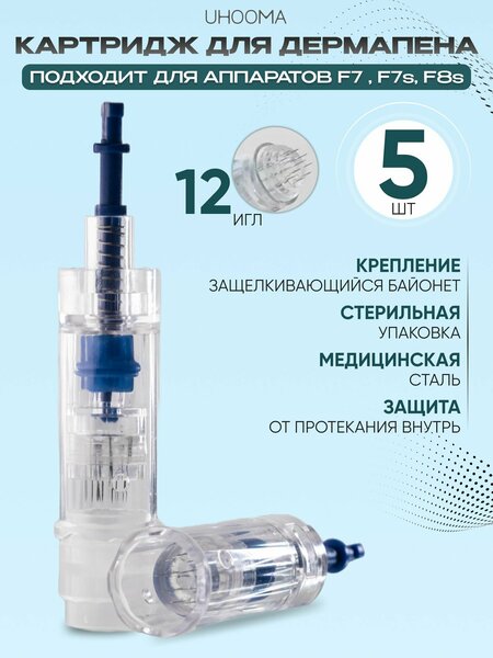 Картридж 12 игл для дермапен к F7s, F30, F8s, 5 шт. Насадка для аппарата фракционной мезотерапии dermapen в комплекте из 5 штук. Данные картриджи подходят для дермапена модели uhooma F7s, F30, F8s. Представляют собой сменный одноразовый mezo картридж в стерильной упаковке. Тип наконечника для дерма ручки: защелкивающийся. Материал расходников для электро мезороллера: хирургическая сталь. Заточка акупунктурная. Зона применения: для кожи лица и тела, а также для бороды и кожи головы, волос, шея, декольте. В зависимости от выбранной глубины проникновения и подобранного к процедуре ампульной сыворотки – мезококтейля бьюти аппарат из дермапена превращается в косметологический комбайн по решению множества различных эстетических проблем, связанных с несовершенствами кожного покрова и общего его вида.