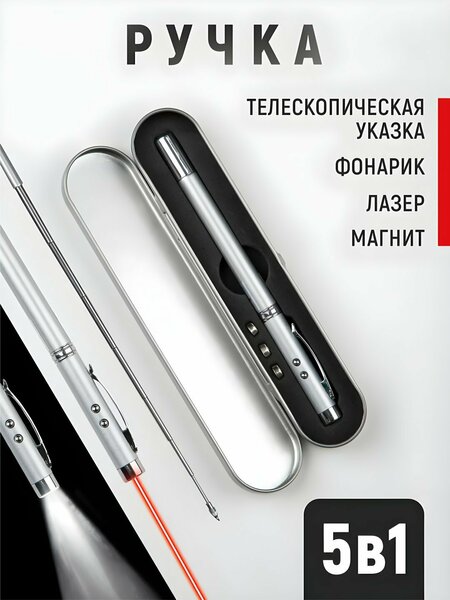 Указка-ручка для учеников и преподавателей: многофункциональность и удобство Указка-ручка сочетает в себе функции лазерной указки, фонарика и магнита, что делает ее незаменимым аксессуаром для учеников и преподавателей. Материал и размеры Ручка изготовлена из прочного алюминия и пластика, что обеспечивает долговечность и надежность в использовании. Размер ручки составляет 180 * 35 * 20 мм, что делает ее компактной и удобной для переноски. Два режима работы Ручка имеет два режима работы: лазерная указка и фонарик. Вы можете выбрать наиболее подходящий вариант в зависимости от ситуации. Элементы питания и комплектация Ручка оснащена часовыми батарейками типа 3*AG3, которые входят в комплект. Это обеспечивает длительное и непрерывное использование ручки без необходимости постоянной замены батареек. Шариковая ручка с выдвижной "школьной" указкой, красным лазером и белым фонариком на торце.
